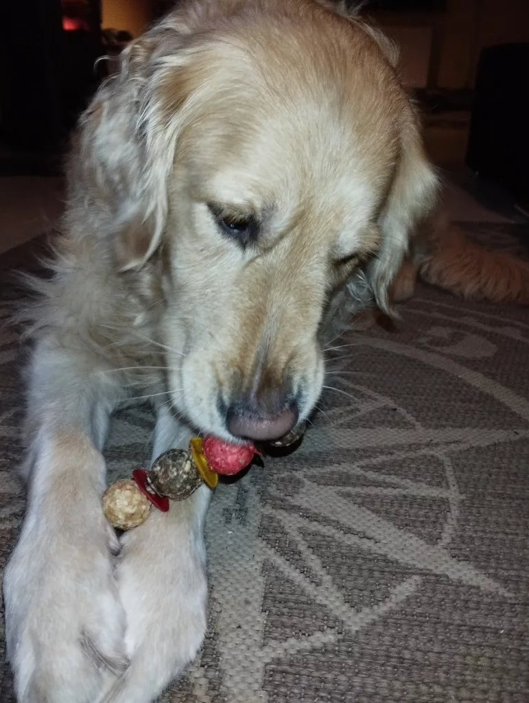 Der Schaschlik besteht aus leckeren Kau-Sticks mit perfekt aufgereihten Snackkugeln darauf. Genau richtig für Hunde wie mich, die gerne kauen, knabbern und sich dabei so richtig beschäftigen. Die Konsistenz ist angenehm fest, aber nicht zu hart. Ich konnte ihn super festhalten und genüsslich Stück für Stück vernaschen.