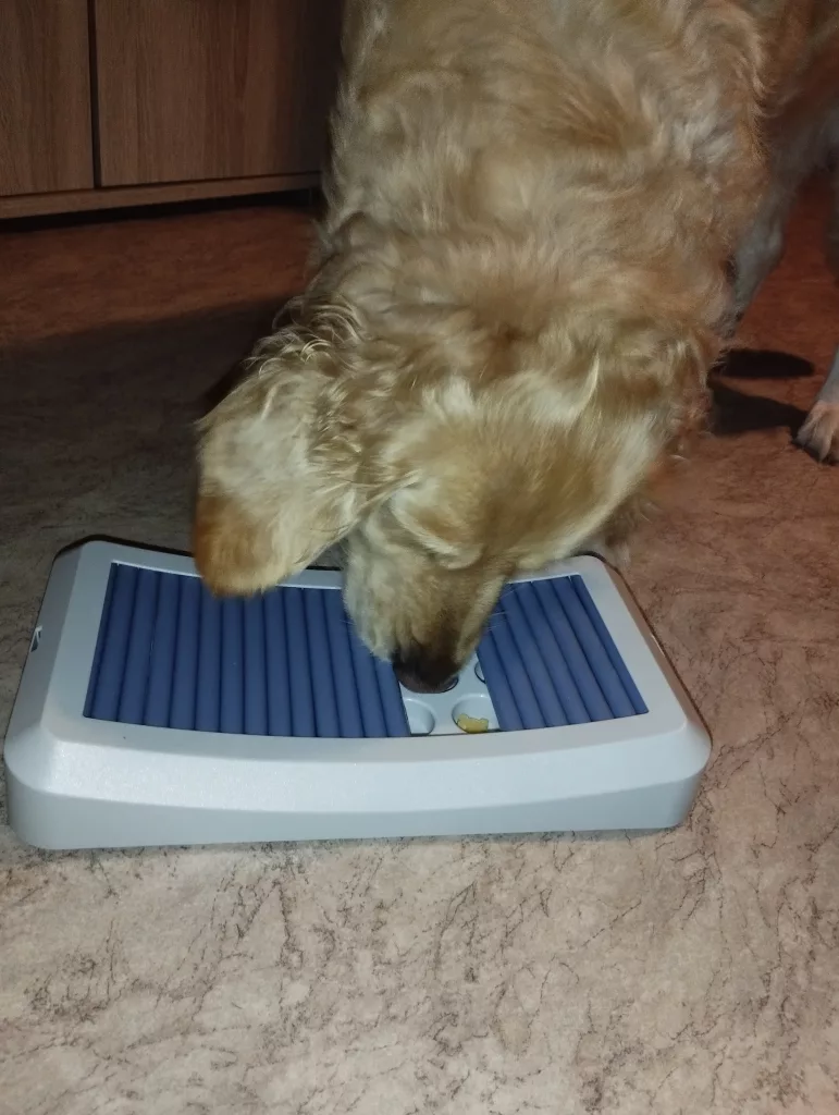 - Spielstruktur: Ein Brett mit mehreren Vertiefungen für Leckerlis oder Trockenfutter, abgedeckt durch verschiebbare Stäbchen. Der Hund muss geschickt seine Pfote oder Schnauze einsetzen, um die Stäbchen zu verschieben und an die Leckerlis zu gelangen.