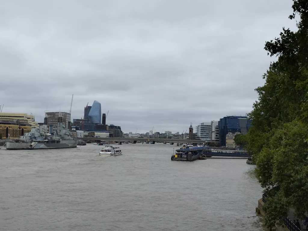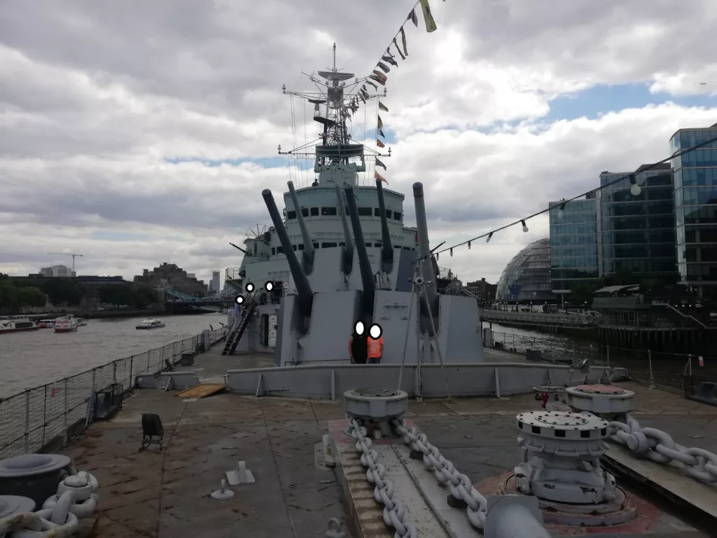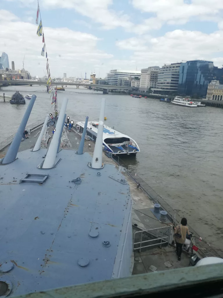 In der Nähe der Tower Bridge, liegt die HMS Belfast. Ein Kreuzer der Royal Navy, welcher als Museum dient. Fertig gebaut wurde die HMS Belfast in 1938 und diente im Zweiten Weltkrieg als britische Seeblockade gegen Deutschland. Als sie 1939 eine deutsche Mine auslöste und massiv beschädigt wurde, konnte sie trotzdem über 3 Jahre repariert und verbessert werden. Nach weiteren Kriegseinsätzen, z.B. im Koreakrieg, wurde sie 1967 in die Reserve versetzt und wird seit 1971 als Museumsschiff genutzt.