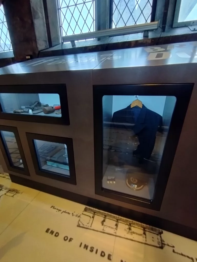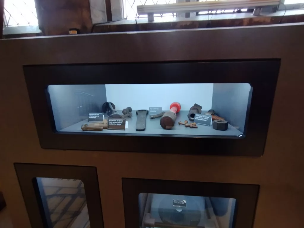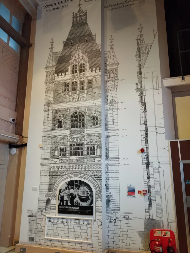 Wenn man im Südturm angelangt ist, geht es dort wieder die 206 Stufen nach unten. Man kommt wieder vorbei an vielen Informationen zur Tower Bridge, unter anderem an den Originalentwürfen der Brückentürme, an Uniformen und an Originalwerkzeug.