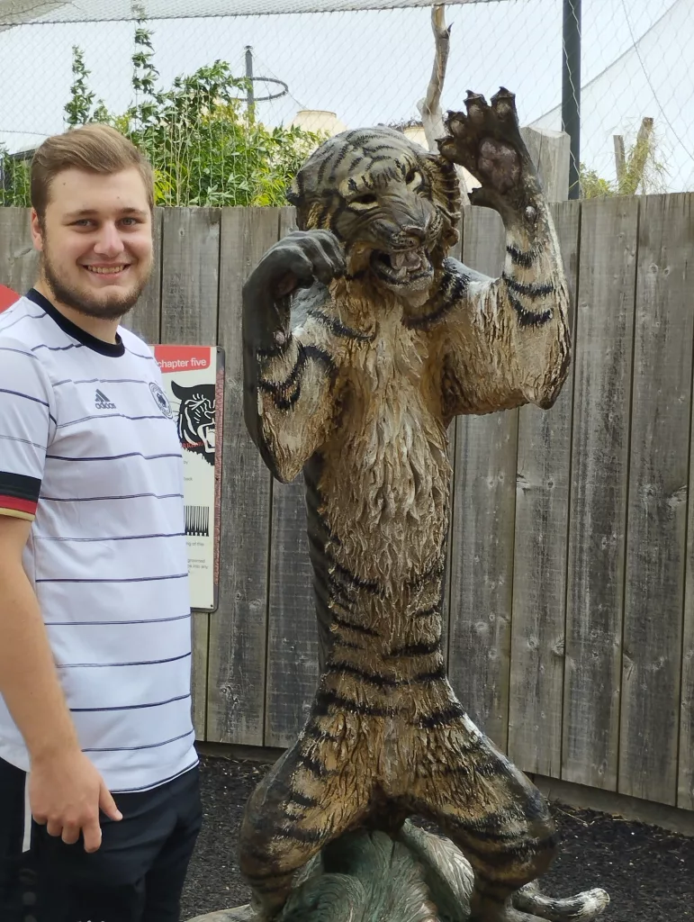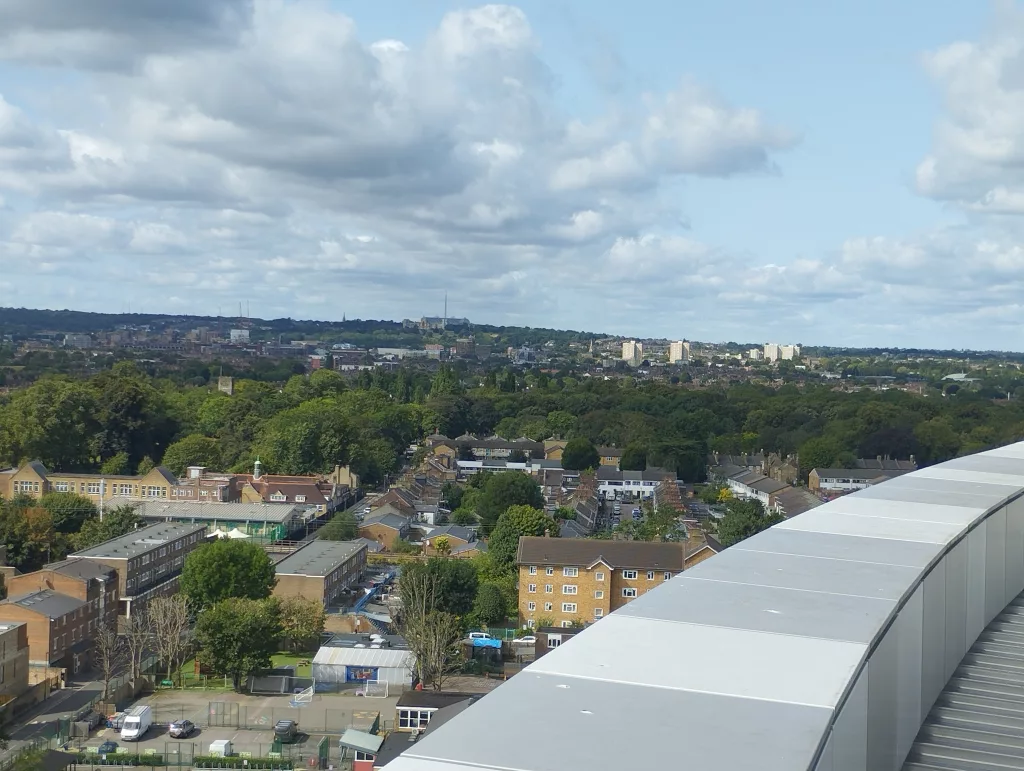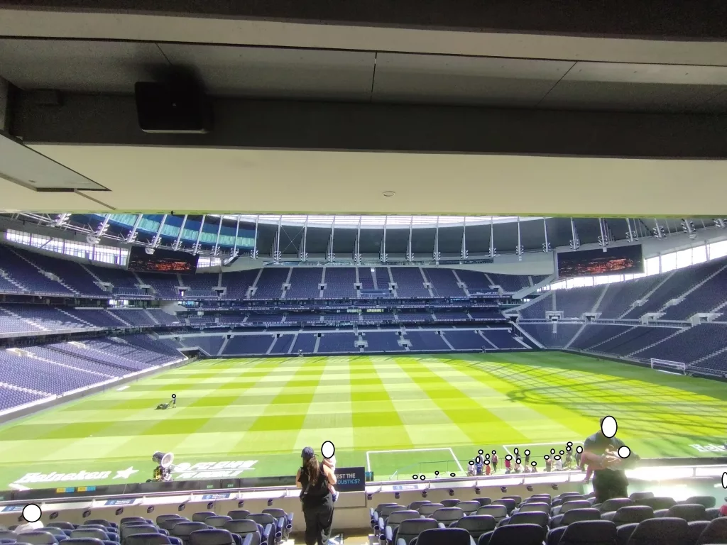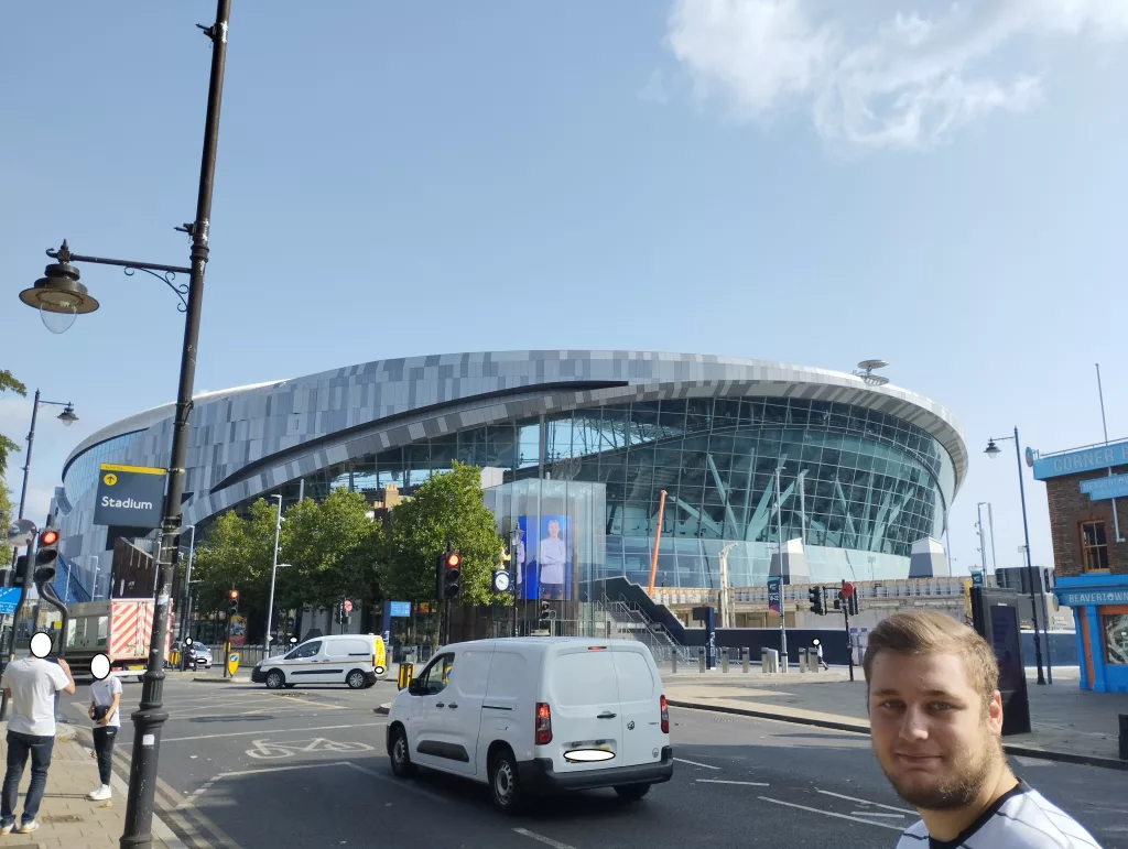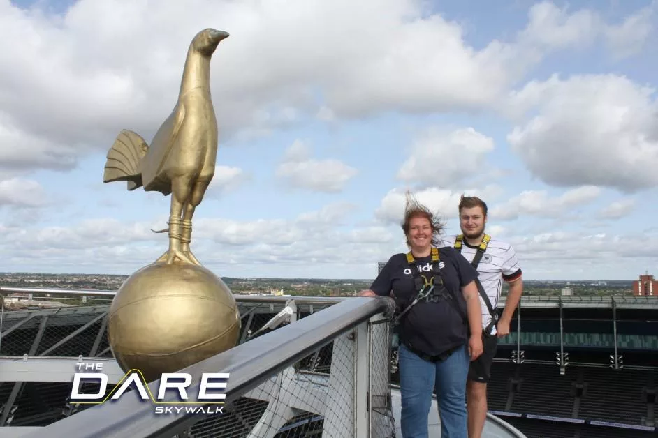 Seit 2020 gibt es im Hotspur Stadium den Dare Skywalk, von dem aus man in 46,8 Metern Höhe einen tollen Ausblick genießen kann. Nach der Anmeldung hat man spezielle Schuhe für den Aufstieg bekommen, man musste sich den Gurt anlegen und es gab eine Einweisung zum Ablauf und zur Sicherheit. Dann ging es los und man musste außen am Stadion steil nach oben laufen, natürlich immer gesichert, damit man nicht runter fällt. Danach geht es auf das schmale Gittertrittbrett, wo man gesichert zum Spielfeld gelangt und neben dem Hahn stehen kann. Ich kann euch sagen, das war verdammt windig und wackelig hier oben und nichts für schwache Nerven. Aber es war ein tolles Erlebnis und das können wir euch sehr empfehlen.