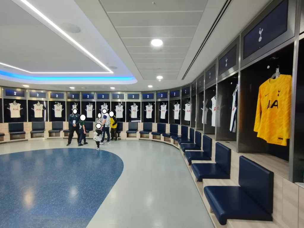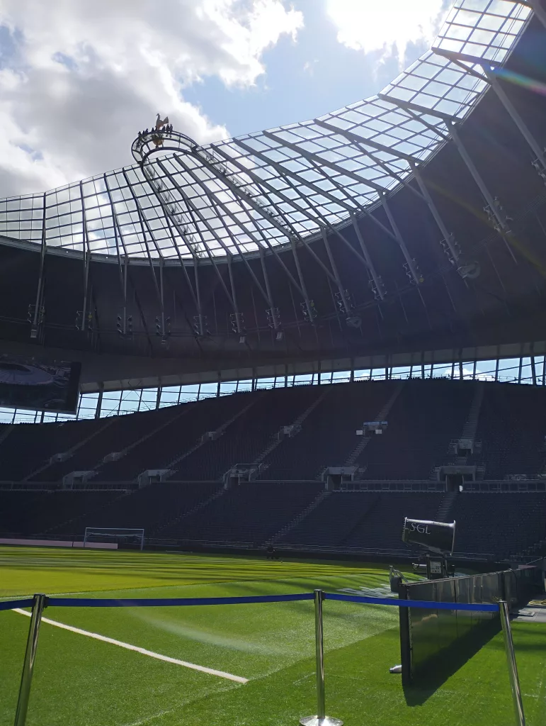 Am nächsten Tag ging es gleich am frühen Morgen ins Tottenham Hotspur Stadium zur Stadiontour. Das Hotspur Stadion liegt im Stadtteil Tottenham, nordöstlich des Londoner Zentrums. Es hat ein Fassungsvermögen von 62.850 Zuschauern und wurde im Jahr 2019 eröffnet. Seht ihr da oben am Dach den Hahn? Dort wollen wir auch noch rauf und den Blick von oben auf das Spielfeld und über London genießen.
