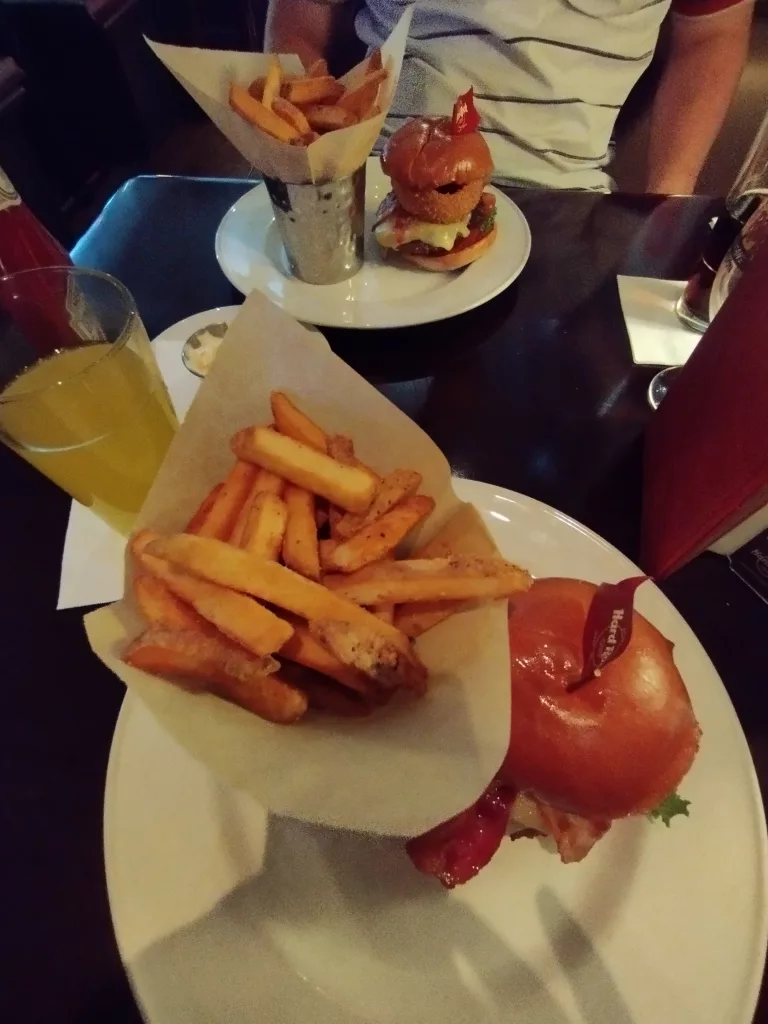 Nach so viel Abenteuer, brauchten wir erst mal eine Stärkung und haben das Hard Rock Café in der Old Park Lane besucht. Wir hatten vorab über Booking das Ticket für das Mittags-Menü bestellt. In dem Erlebnis ist ein Burger nach Wahl, Pommes, Cola und ein Nachtisch enthalten und es kostet ca. 30 Euro pro Person.