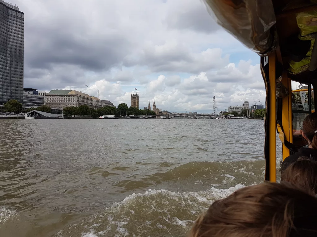 Danach gab es noch eine Erkundung per Boot (Thames River Cruise) über die Themse. Von der Themse aus hat man einen guten Blick auf viele historische Gebäude uns Sehenswürdigkeiten in London. Es gibt sogenannte Wassertaxis, man kann aber auch eine Tour mit einem Speed-Boot oder einem Ausflugsschiff machen.