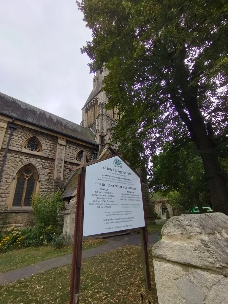 Nahe des Regent’s Park, im Stadtteil Camden, gibt es die „St. Mark’s Church“. Sie wurde erst nach langem hin und her mit den Grundstücken und wegen dem Bau eine Pubs, im Jahre 1853 erbaut. Sie wurde im frühgotischen Stil aus Kentischem Kalkstein errichtet. Der Regent’s Park ist einer der königlichen Parks in London und hat eine größe von 2 Quadratkilometern. Der Park besteht aus Rasenanlagen mit Freizeiteinrichtungen und einem See mit Ruderbooten und Wasservögeln.