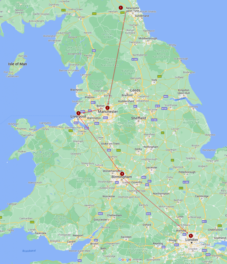 Es sollte von Newcastle upon Tyne nach Manchester, dann nach Liverpool, über Birmingham, bis nach London gehen.